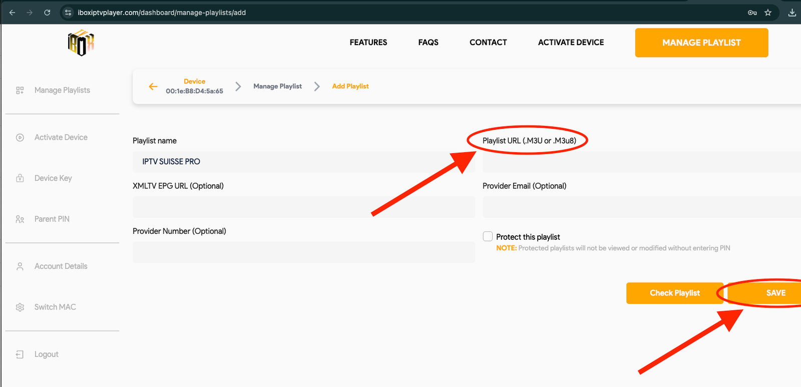 - Connectez-vous avec MAC ADDRESS et le DEVICE KEY affichés sur la page d’accueil de l’application, puis cliquez sur « +ADD PLAYLIST« .